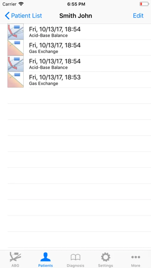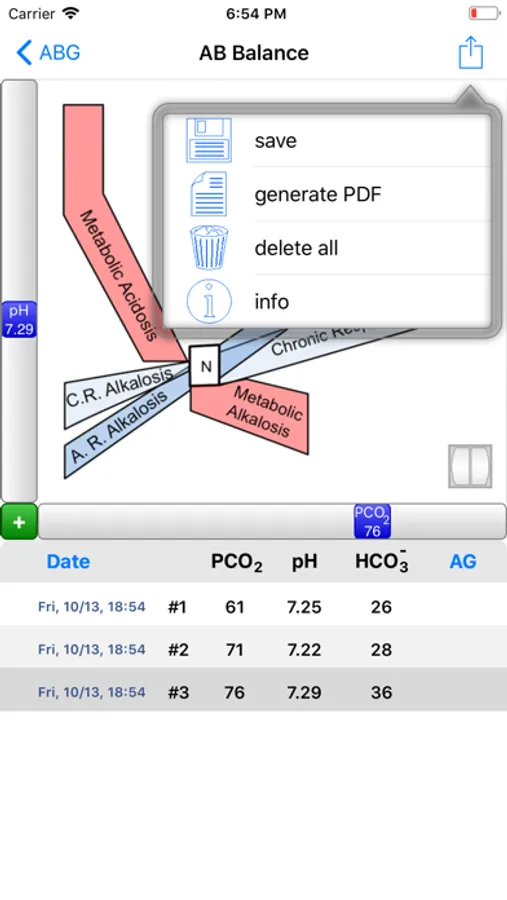 • Serial evaluations of both Gas Exchange and Acid-Base balances can be saved and are available on a table.