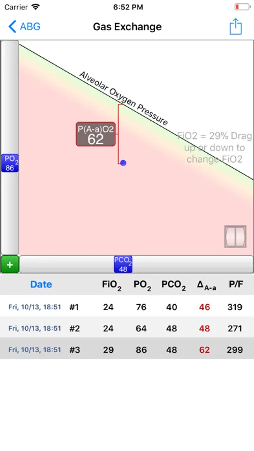 • The PaCO2-PaO2 plot allows the assessment of the patient gas exchange status, by means of the computation of the alveolar–arterial oxygen gradient (P(A-a)O2) and P/F ratio.