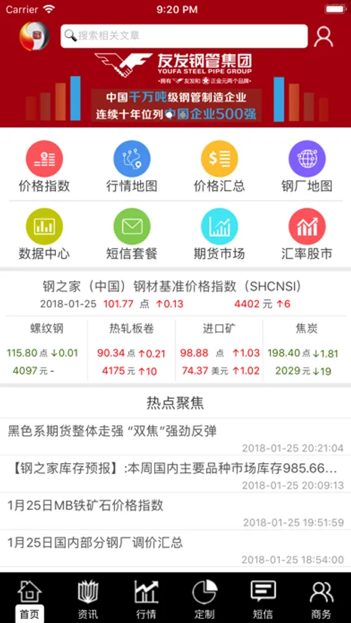 线材、螺纹钢、中厚板、冷热板卷、大中型材、镀锌板卷、彩涂板卷、电工钢、带钢、无缝钢管、焊管、不锈钢、结构钢、优焊线、冷镦钢、拉丝线、工具钢、模具钢、轴承钢、弹簧钢、铁矿石、生铁、钢坯、废钢、煤炭、焦炭、练焦煤、铁合金、铜、铝、镍、锌,行情资讯,尽在掌握!