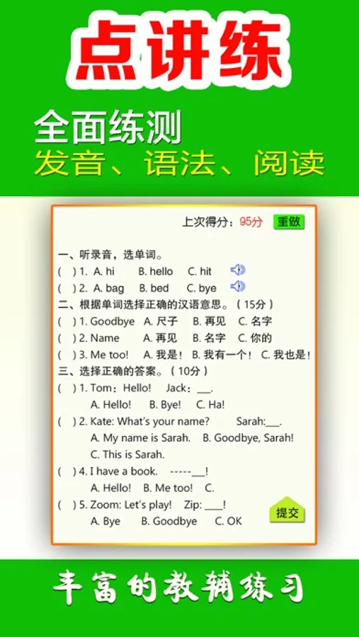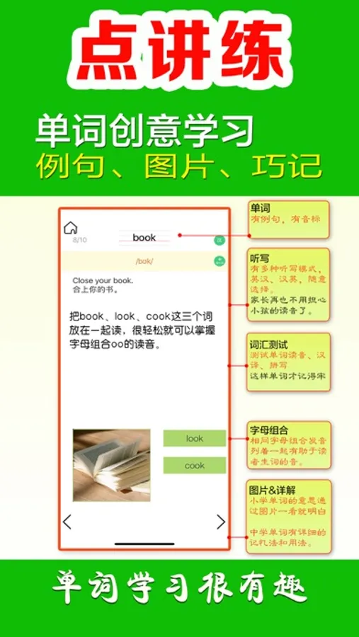 1. 点读:教材的课文全部都有点读。真正实现哪里不懂点哪里!家长、老师,再也不用担心自己发音不准影响孩子的发音了。
