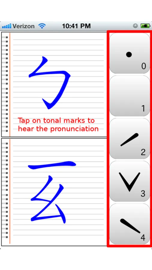 Zhuyin is the first official phonetic system for transcribing Chinese. Zhuyin Notebook makes learning this phonetic system a breeze. Simply choose the initial and final combination and click on 1 of the 5 tonal marks to hear the correct pronunciation.
