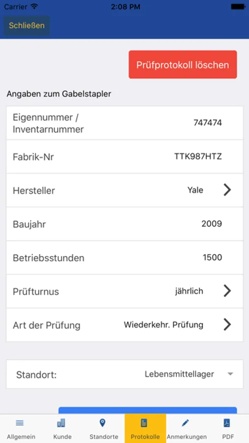 Sie können die Staplerprüfer iPad App mit eingeschränkter Funktionalität benutzen. Aus Sicherheitsgründen dürfen Prüfprotokolle aber nur von zertifizierten Fachkräften erstellt werden.
