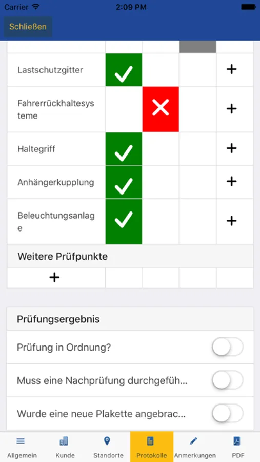 „Neue Prüfung starten“ führt Sie systematisch durch den Prüfprozess an dessen Ende Sie einen PDF Prüfbericht generieren. Den PDF Prüfbericht können Sie anschließend auf Ihren Rechner übertragen und speichern, direkt vom iPad ausdrucken oder per E-Mail versenden.