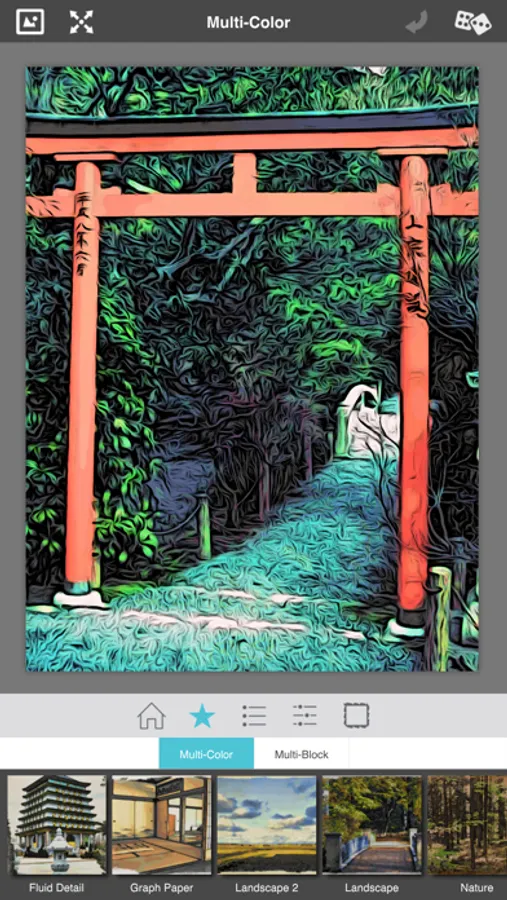 • The Multi-Color style uses all the original colors in your photo. By adjusting the "Image Color" slider you can reduce or add colors to your artwork giving it a variety of printed-styles, from a full-color block process to spot-color ones.