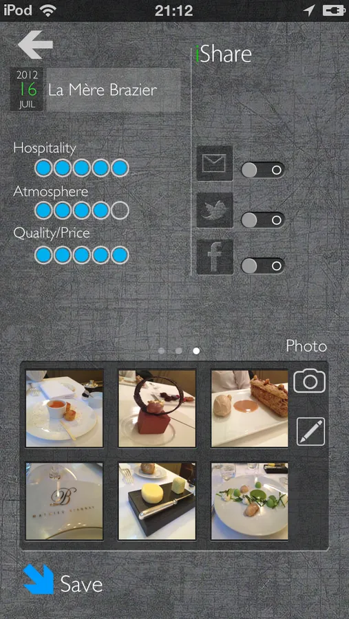 You want to go out to the restaurant and do not trust in anonymous recommendations, then follow those of your connections. Testing a new bar, you like it? You want your friends to discover it by knowing where they put their feet? Then note the area quickly, take some pictures of your dishes if you like, leave a comment if you are inspired and share your experience on Facebook, Twitter or email it!