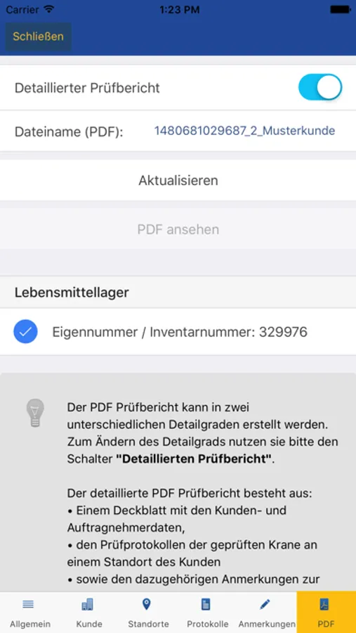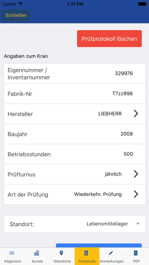 Sie können die Kranprüfer iPad App mit eingeschränkter Funktionalität benutzen. Aus Sicherheitsgründen dürfen Prüfprotokolle aber nur von zertifizierten Fachkräften erstellt werden.
