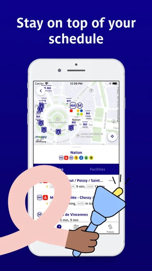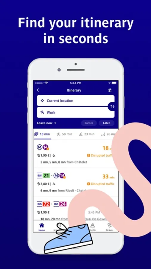 For all transport modes, find bus, subway, tube, and train timetables in real time, Subway and RER train maps, routes, disruption alerts for the whole RATP network and many other services.