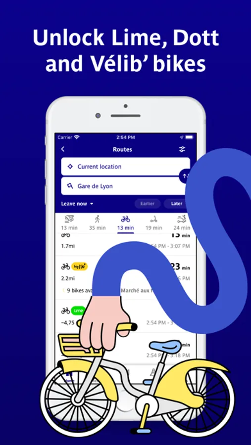 All your journeys in Paris and its suburbs at your fingertips: Bus, Subway, Tube, RER train, Tram, suburban train, Velib' bike-share, LIME bike-share and DOTT bike-share, Marcel hail ride, TIER scooters, LIME scooters and DOTT scooters or Noctilien night bus and Orlyval airport shuttle.