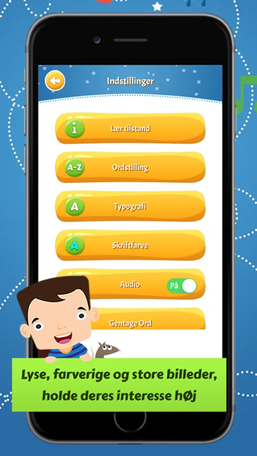 ** Navigationen er blevet gjort langsom med vilje, således at barnet vil lytte til hele ordet, da et barn ellers har tendens til at trykke på iPhone eller iPad meget hurtigt **