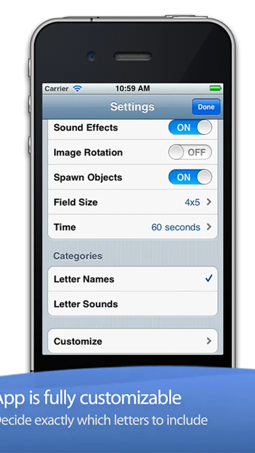 ● Turn individual items on or off - Want to only practice the first four letters of the alphabet? No problem, just turn all other letters ON or OFF