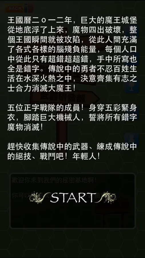 王國曆二o一二年,巨大的魔王城堡從地底浮了上來,魔物四出破壞,整個王國瞬間就被攻陷,從此人間充滿了各式各樣的腦殘負能量,每個人口中從此只有超錯超超錯,手中所寫也全是錯字。傳說中的勇者不忍百姓生活在水深火熱之中,決意齊集有志之士合力消滅大魔王!