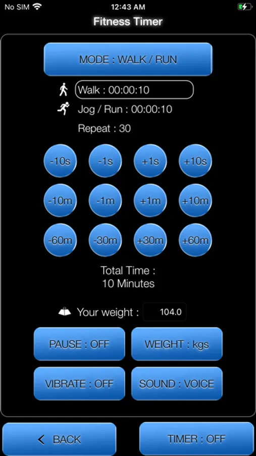 • Fitness Timer calculates steps taken and calories burned based on weight, distance and activity!