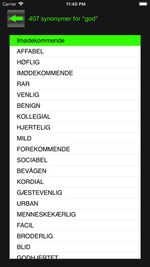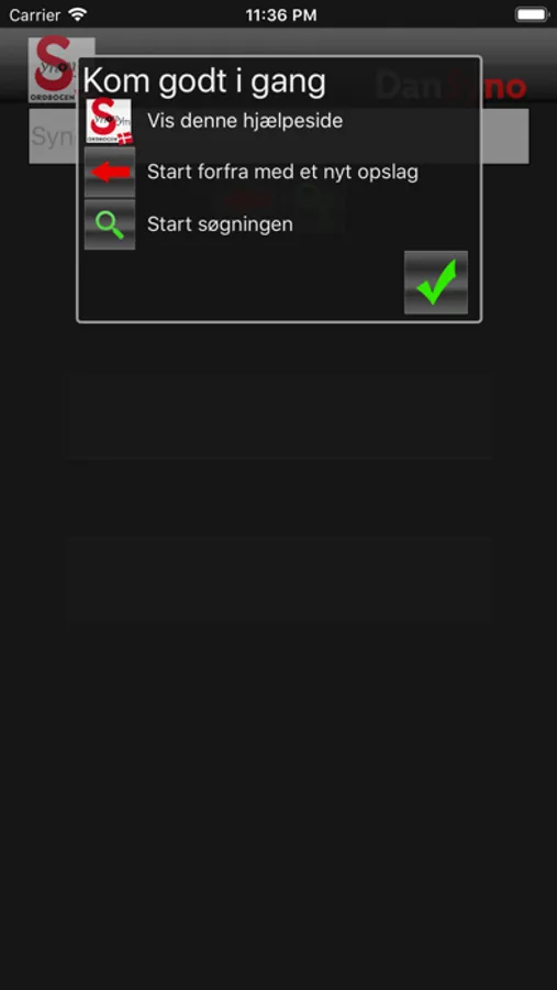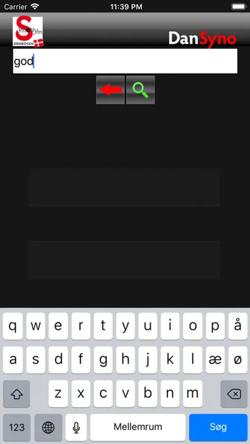 Enter a synonym. Press the search button (the magnifying glass) and DanSyno will quickly search the more than 40.000 registered words to find relevant synonyms.
