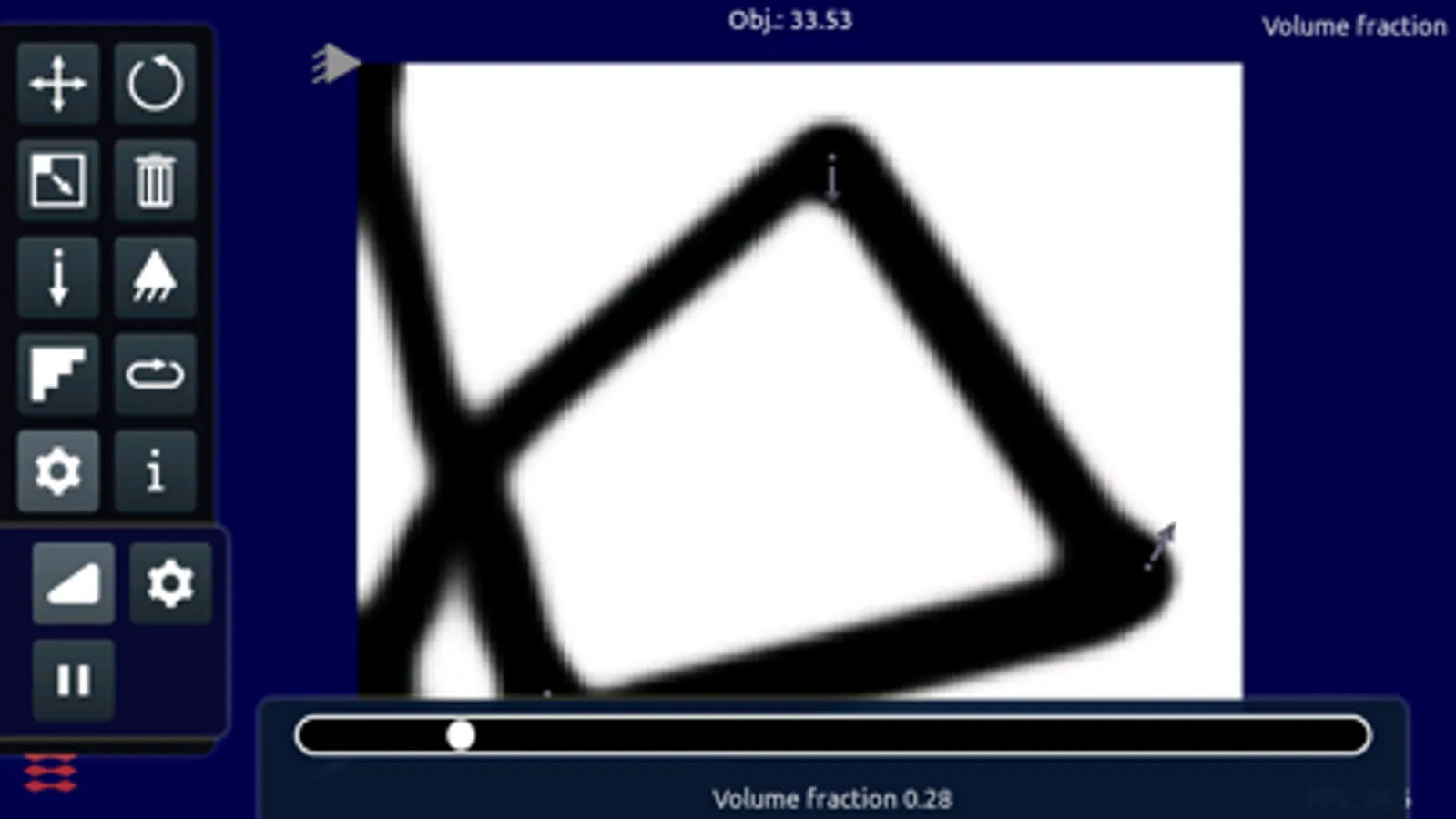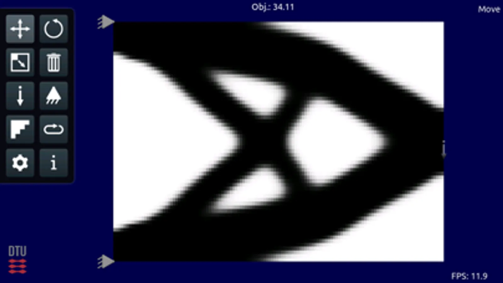 Move loads and supports and watch the design evolve to a new minimum. Experiment with different volume fractions and grid sizes and see what happens.
