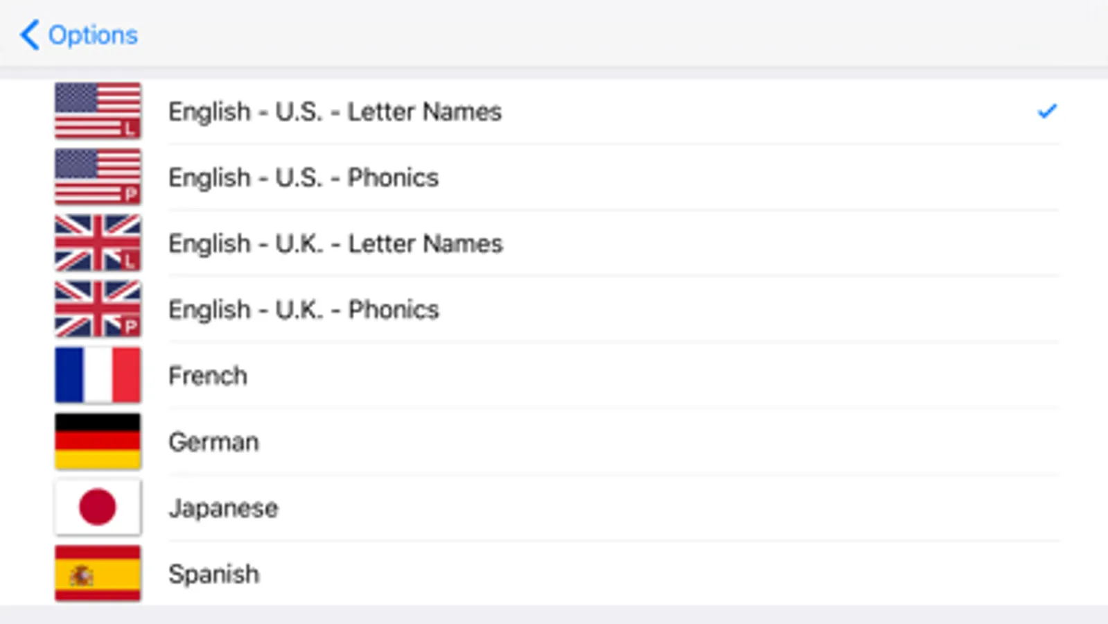 * Phonics -- English word lists includes options for spelling with phonics or letter names.