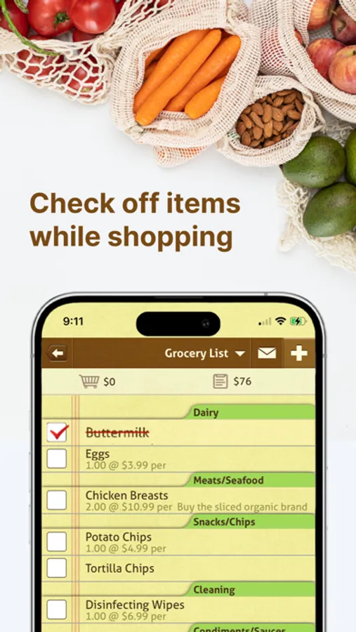 - Organize your shopping list any way you want – by food category, by recipes, or by available grocery coupons