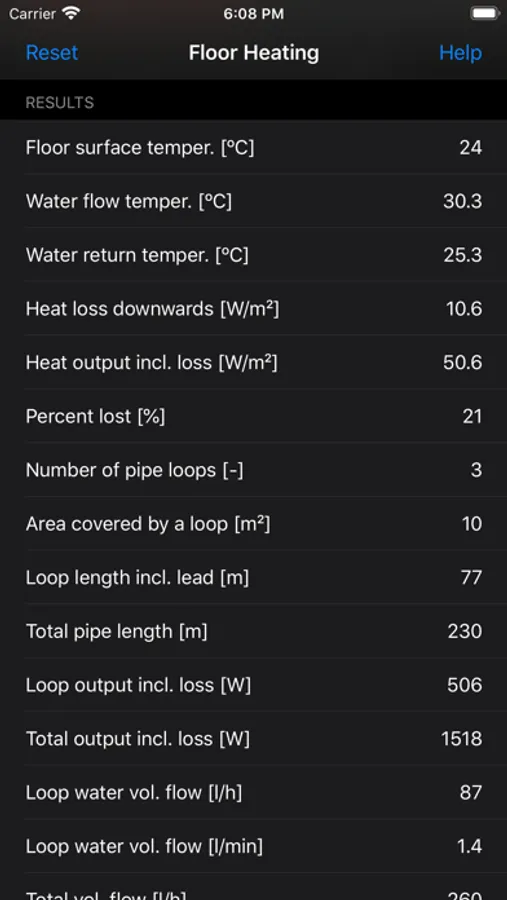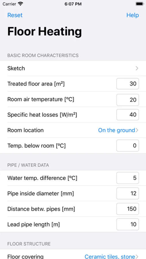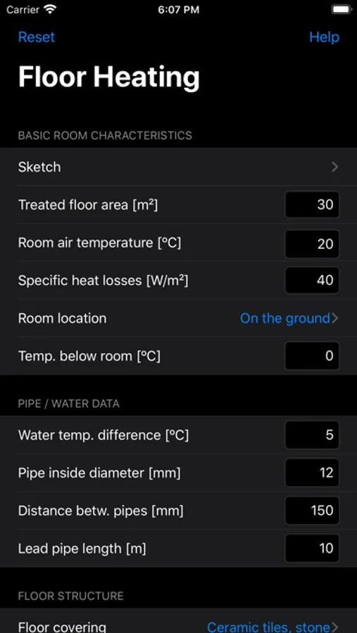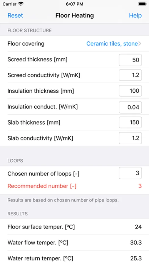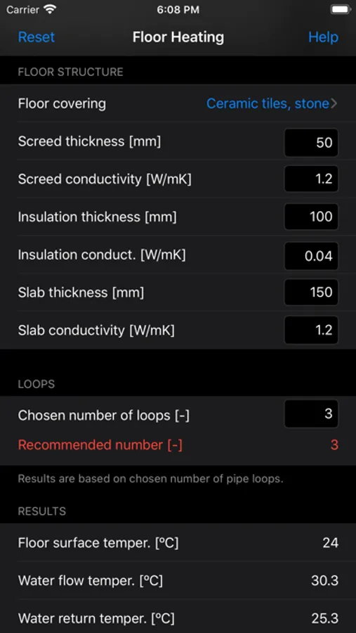 Basic floor heating characteristics can be quickly determined. It is interesting to observe how different floor coverings, insulation thickness and specific heat losses of a room or a larger part of a building affect the required water temperature in order to keep the room warm.