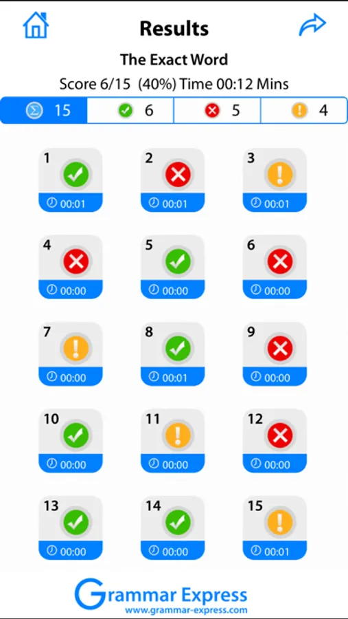 A summary of the test is presented at the end of each test. It shows you the time you took, the score, which questions you answered correctly and where you were wrong for every question. And yes, you can E-MAIL the results.