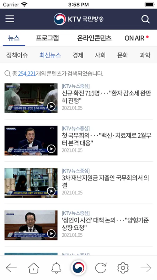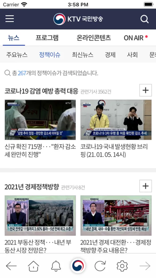 뉴스 : KTV에서 방영된 뉴스 콘텐츠를 주요뉴스, 정책이슈, 최신뉴스, 분야별 뉴스로 구분하여 제공