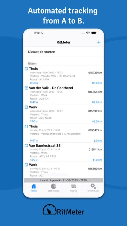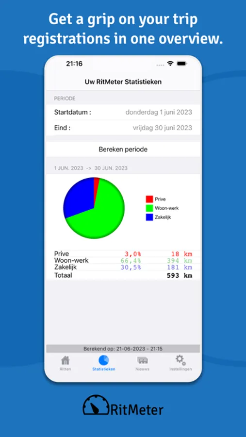 RitMeter goes a step further than most mileage programmes. We unburden you completely, not just with mileage registration, but with a weekly and monthly report of your mileage. This report is sent to your e-mail address. This paid service ensures that you receive the report every week and month, which means you cannot forget it. This service, which costs only a few euros per month, provides you with a carefree and complete administration.