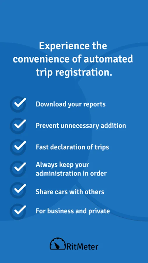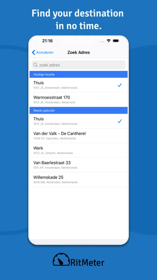 With RitMeter, you can easily and quickly register your mileage for tax purposes or declaration. RitMeter is user-friendly and complete. Addresses, mileages, and directions are saved for you. Your administration is always complete because RitMeter regularly reports your trips. You will receive weekly and monthly complete reports, so that you always have your information in order.