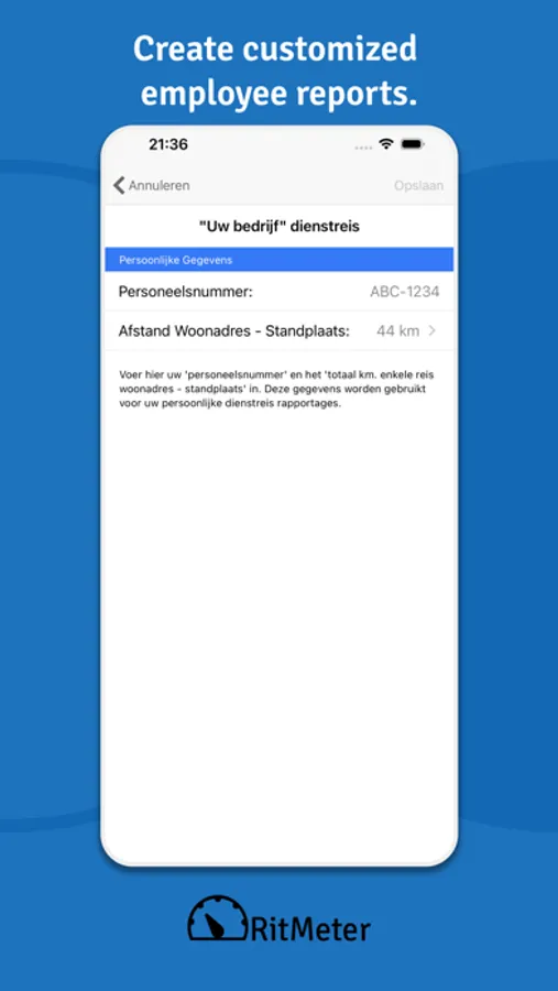 The RitMeter server provides reporting and a full back-up of the mileage registration data. If you lose your phone, you do not lose your data. You have your own login page on this server and you can view your mileage registration at any time. (http://www.ritmeter.nl)