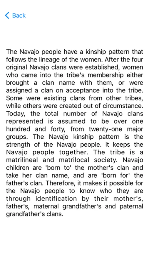 The goal of "Navajo Clans" is to provide correct, accurate and common Navajo clans to everyone interested in learning and preserving the Navajo clan language. This application is the perfect educational learning tool for anyone interested in learning the most valuable artifact to the Navajo people.