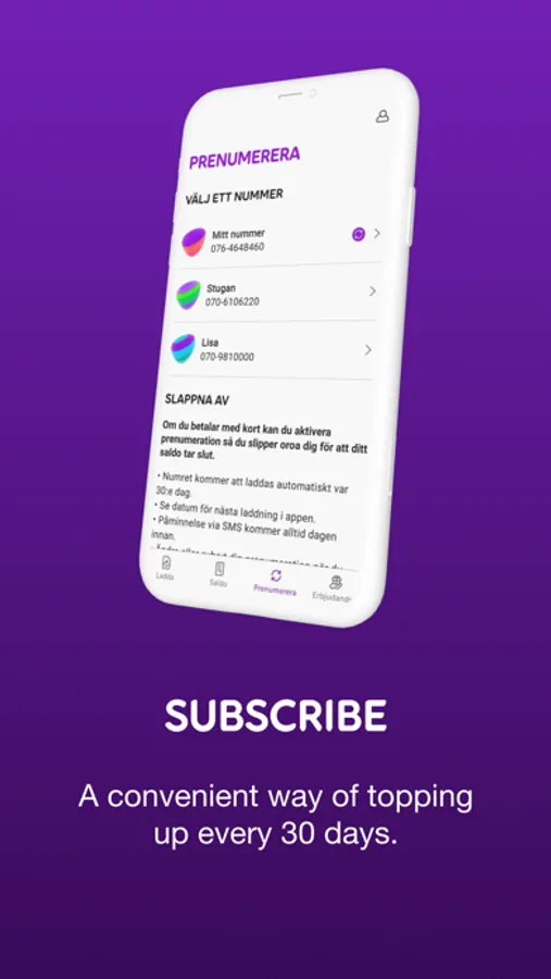Välkommen till en enklare värld. I Telia Laddas applikation väljer du själv när och vad du vill ladda vilket innebär att du alltid har full kostnadskontroll och flexibilitet. Du kan enkelt och snabbt ladda ditt eget eller någon annans Telia kontantkort direkt via din smartphone och enkelt betala med kontokort. I Telia Ladda applikationen kan du även se ditt eller någon annan familjemedlems saldo. Telia Ladda fungerar även för Mobilt bredband kontant.