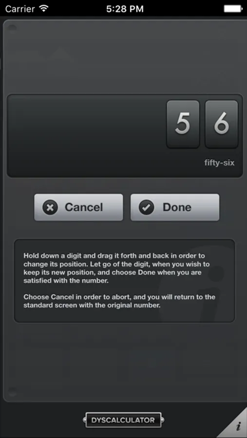 A common mistake is to type in the digits of a number in the wrong order. With the Dyscalculator you can easily swap the digits around until you get the correct number.