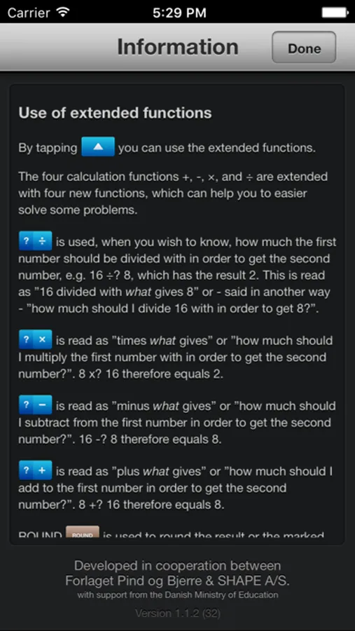 Four new arithmetic operations will help you when you need to know how an arithmetical problem should be solved. The new arithmetic operations help you when e.g. the question could be: "What should I multiply with, when I have a recipe for 4 people, but I need it for 7?" Here you would type 4 x? 7 and get the result 1.75.