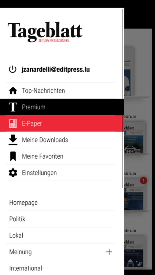 • die Funktionen „Meine Downloads“ (ganze Zeitungsausgaben) und „Meine Favoriten“ (einzelne Artikel)