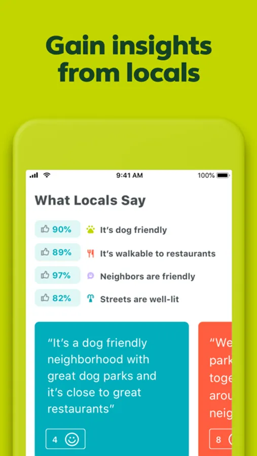 • What Locals Say: Learn what’s to love about a neighborhood—like whether people feel safe walking alone at night, if there’s easy parking, or if people decorate their homes for the holidays —from people who know it best: the locals!