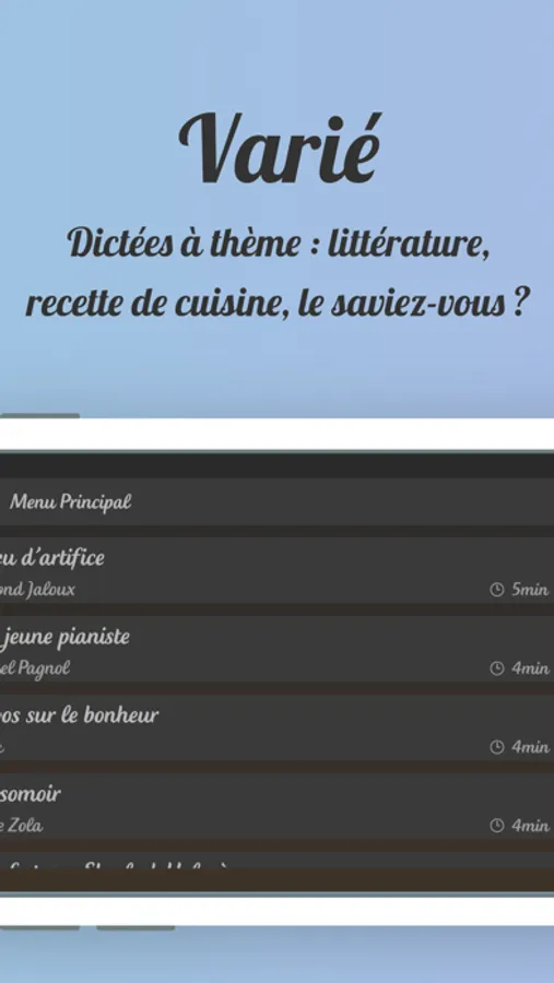 En 10 minutes (grand maximum), vous pourrez faire une dictée parmi plusieurs proposées. Celles-ci sont réparties en trois niveaux : simple, moyen, difficile.