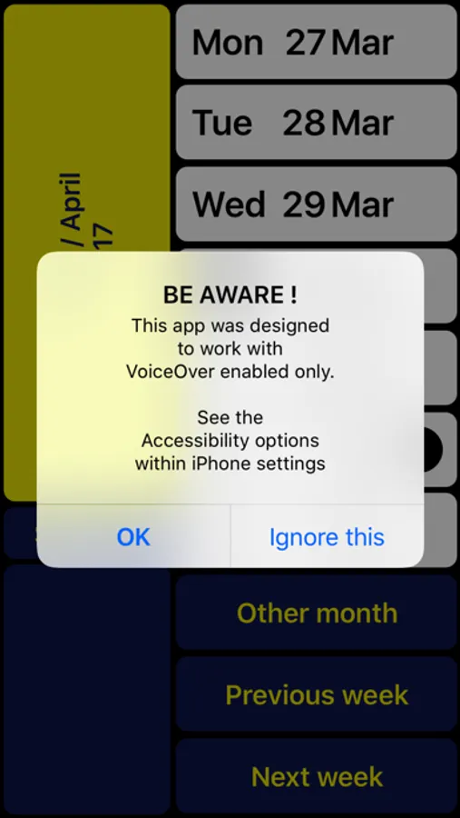 VO Calendar is a weekly calendar specifically designed to be used with VoiceOver.