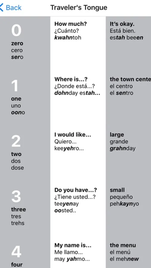 When we travel to a foreign country we are demonstrating an interest in that culture. Speaking a little of the native language is part of the cultural experience. There are many Applications and phrase books on the market that offer far more words and phrases, and they are excellent reference sources. However, Traveler’s Tongue provides the most essential and practical words and phrases. They are meant to be learned because you will have an opportunity to use them often. Each entry provides a written phonetic spelling of the word as well as an auditory function.