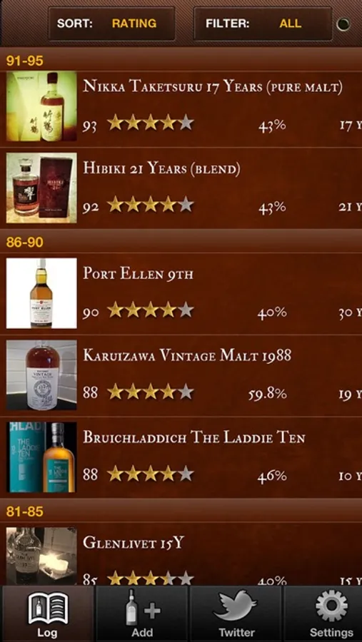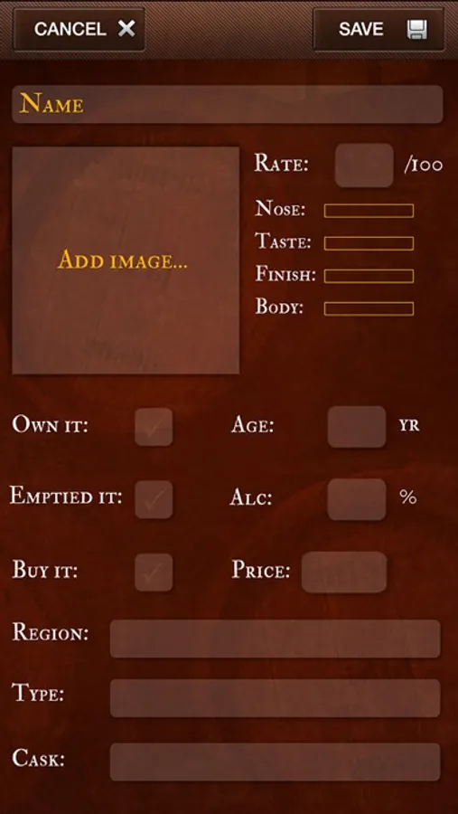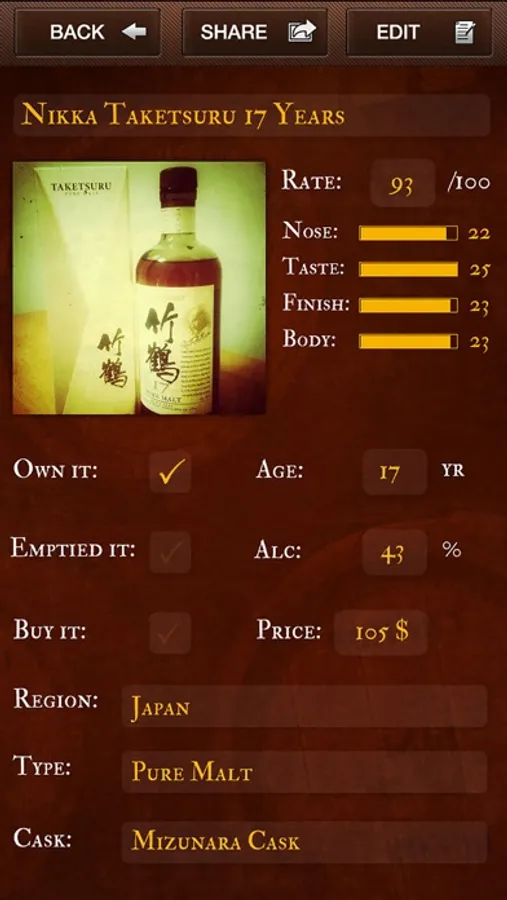 Store up to 5 whiskies with the free version. Upgrade to the full version to store an unlimited number of whiskies!