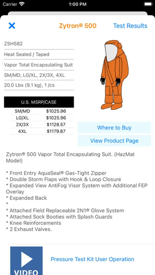 The app contains a database of tested chemicals, searchable by chemical name or CAS number. A user completes a short questionnaire on the hazard situation, and HazMatch recommends a protective garment matching the exposure criteria. Each garment recommendation includes detailed product information.