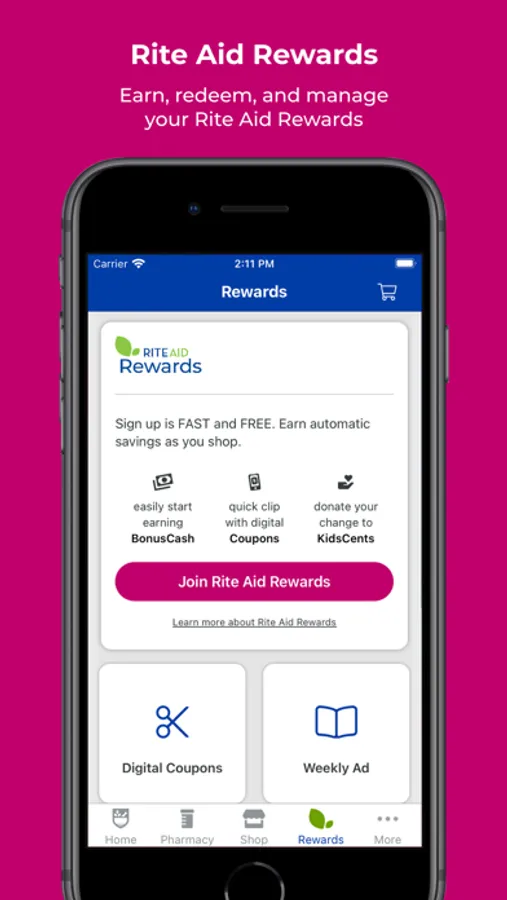 Manage your prescriptions, shop for your whole health needs, earn Rite Aid Rewards points and convert to BonusCash for more savings. The Rite Aid Pharmacy app is here to help you not just get healthy, but get thriving!