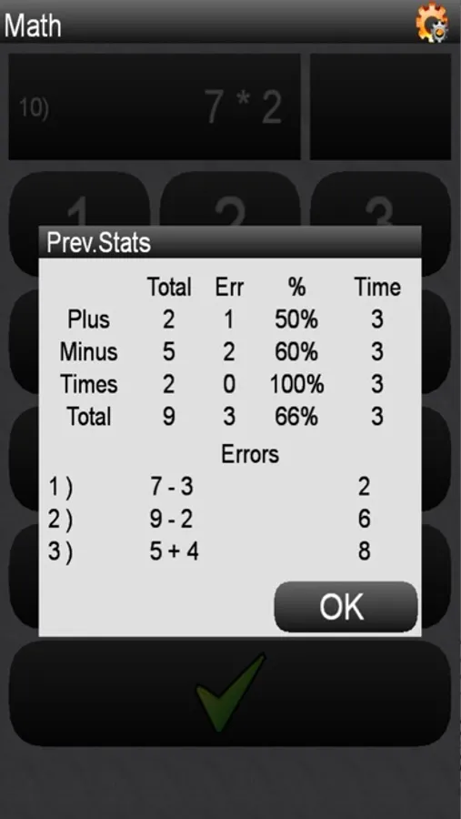 The parent can configure what type of math skills and at what level to exercise. Parent should instruct child how many problems to solve. Last test results (including total number, number of errors, percent correct and average time for each type of math operation) as well as incorrect answers are saved. The report is available and can be used by the parent to monitor child success. If number of errors or average time is unsatisfactory, parent can optionally instruct the child to take the test again.