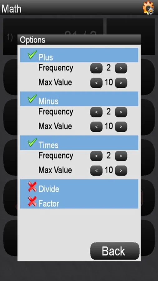 Each mathematical operation Plus (addition), Minus (subtraction), Times (multiplication), Divide (division) and Factors (especially useful to prepare for notoriously difficult 60-second sweep) can be either opted out, or once selected can be configured for frequency. Plus, Minus and Times also can be configured for the Max-Value – maximum result for addition, or max first operand for subtraction and multiplication. This way, for example, the parent can configure the test for infrequent subtraction from numbers as large as 30 and more frequent multiplication by 2, 3 and 4, so the child still practices subtractions while starting to study multiplication table.