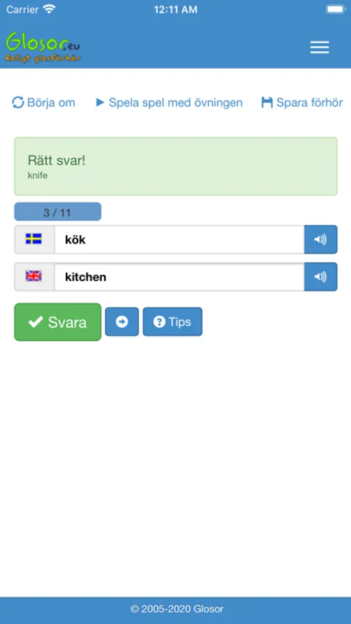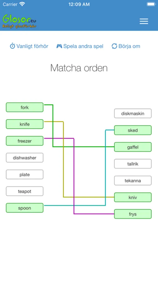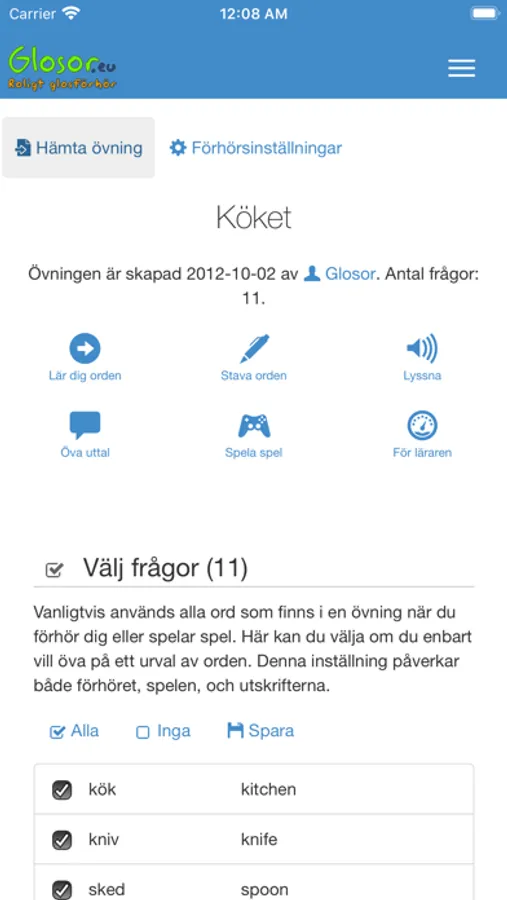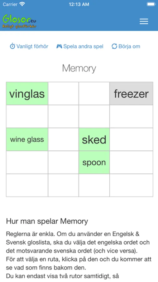 Du kan välja bland flera förhörsmetoder. Bland annat snabbförhöret, där du får en fråga och får välja bland flera alternativ och bara trycka på rätt svar - ingen skrivande. Du kan också spela spel som "memory" och "matcha orden".