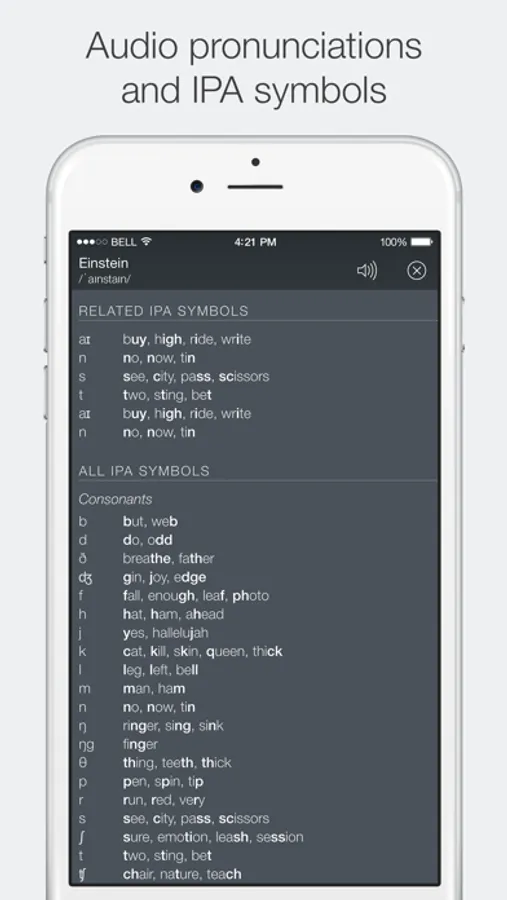 • Clear Pronunciations: Hear high-quality audio pronunciations in American, British, and Australian English with both male and female voices. Content-sensitive IPA guides are also available for pronunciation assistance.