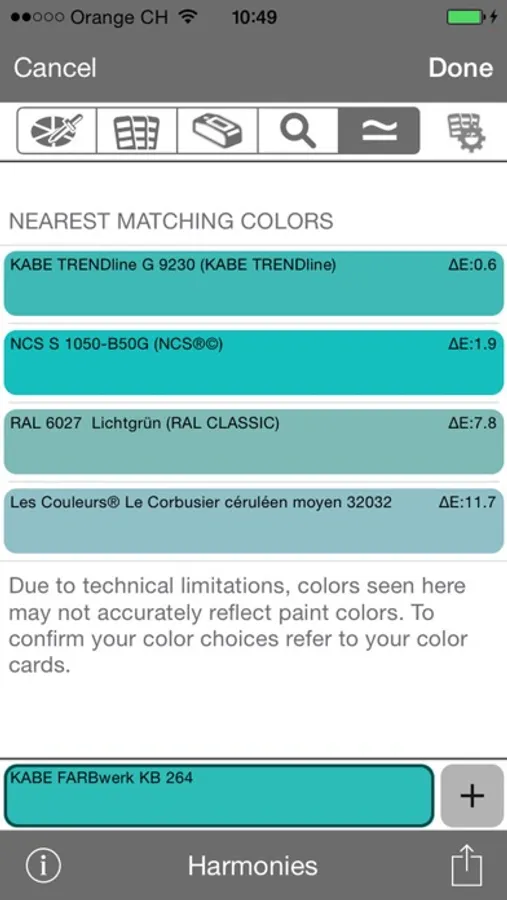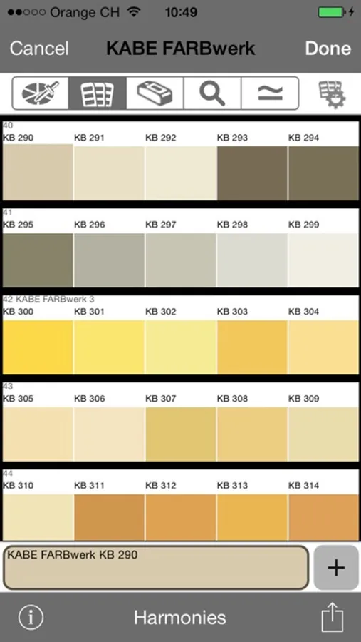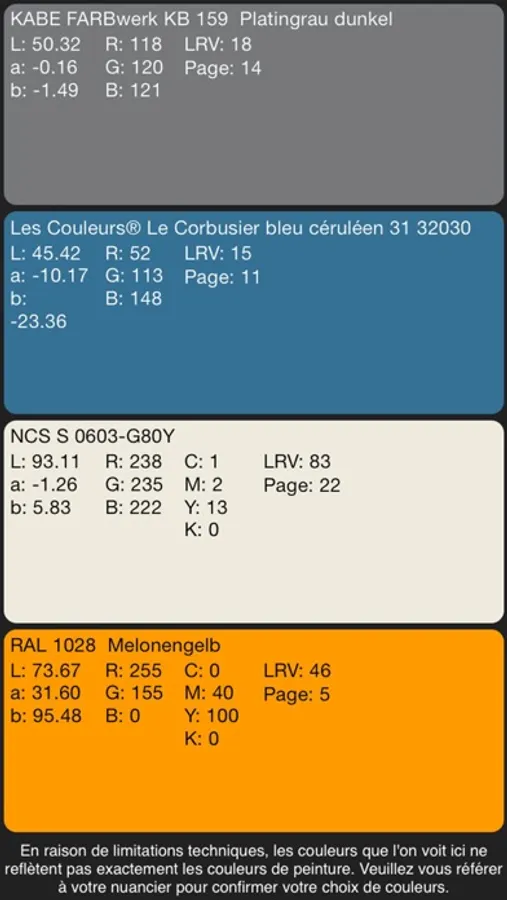 KABE-Farben App for iPhone/iPad contains all FARBwerk, TRENDline, Les Couleurs® Le Corbusier, NCS®© Index and RAL CLASSIC colour references as well corresponding L*a*b*, sRGB and LRV values.
