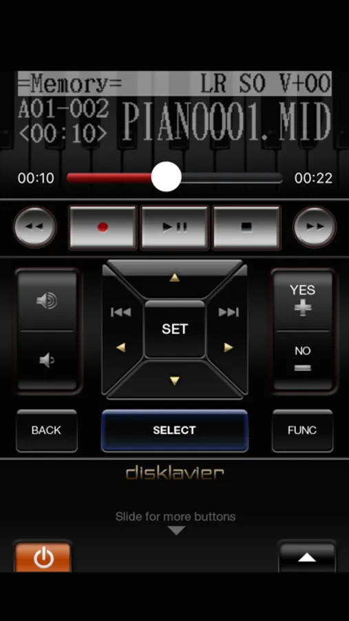 All functions that were possible with the infrared remote control (that was included with the Disklavier E3 or DKC-850) have been made available on iOS devices (iPhone/iPod touch/iPad). Moreover, the E3 Controller displays the screen of the control unit of Disklavier, so you don't have to physically go to the piano to confirm, for example, a song title. All that's required is your ability to access the wireless router that is connected to your Disklavier.