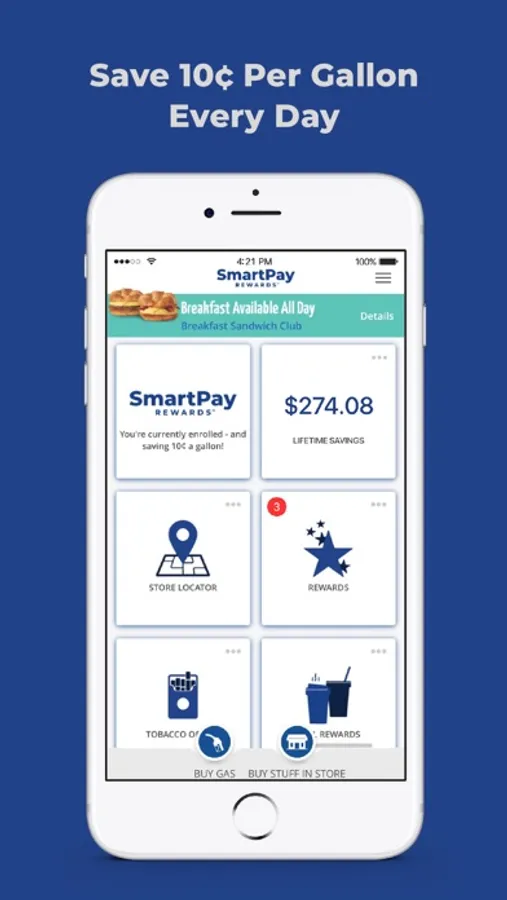 The SmartPay Rewards app is a convenient way to save 10¢ per gallon on gas, every day or pay for in store purchases. To make your visits even more rewarding, every time you use the app you will earn progress towards earning free drinks and food.