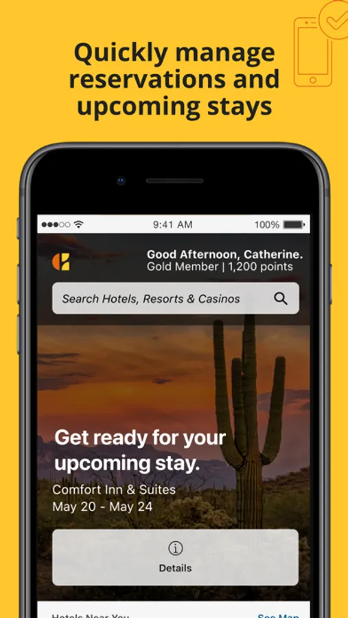 Travel with Ease with the Choice Hotels Mobile App. Search nearby hotels, manage your stays, redeem your points and book rooms with ease and at the lowest price, guaranteed. Whether you’re planning a business trip, family vacation—or just need to make a last-minute reservation—the Choice Hotels App for iOS makes traveling even easier.