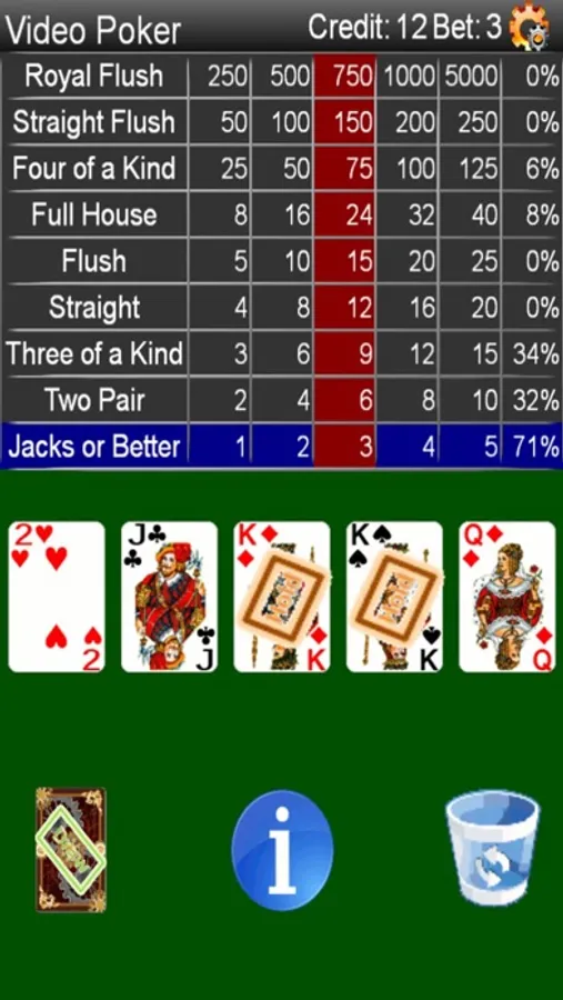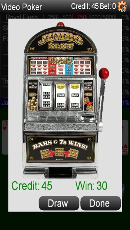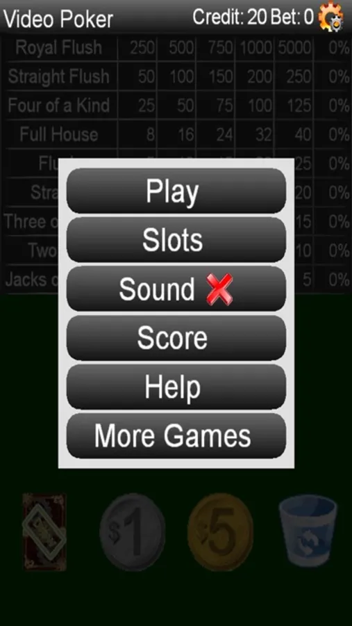Tap $1 or $5 coins to bet. Tap on the deck in the lower left corner to draw. Select cards to hold and click on the deck to draw again. Winning combination along with probability of return on your money is highlighted on the payout table. Once run out of money go to the Menu/Slots to win more credits.