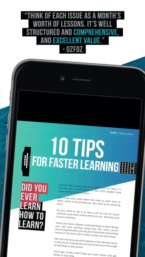 ***** "I absolutely dig this magazine and the concept. Charl is a talented and engaged instructor with some real guitar chops, and he's put together a truly excellent instructional guide. Been playing on-and-off for quite some time, but never got around to learning guitar in an organized and methodical way. This presentation is perfect for me, and it's done very well. Excellent layout and design, and very helpful, bite-sized lessons throughout. At a buck-99 an issue, you simply cannot go wrong with this thing. Serious kudos to Charl and his little company for putting out a first-rate product for the iPad." - Spoodler