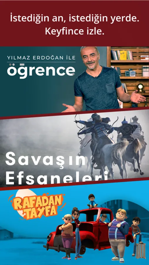 Ücretsiz izleyebileceğin yüzlerce dizi, film, belgesel, çocuk ve arşiv içeriği TRT İzle'de! İstediğin an, istediğin yerde, keyfince izle!