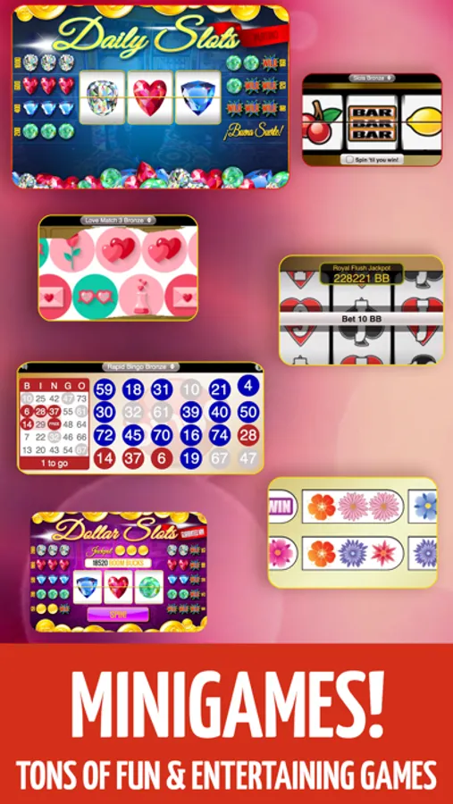 - DOUBLE your chances to win COLOSSAL JACKPOTS from a selection of ENTERTAINING MINI GAMES like Scratch Cards, Pull Tabs, Slots, Money Wheel, Rapid Bingo and Dice while you play Bingo!